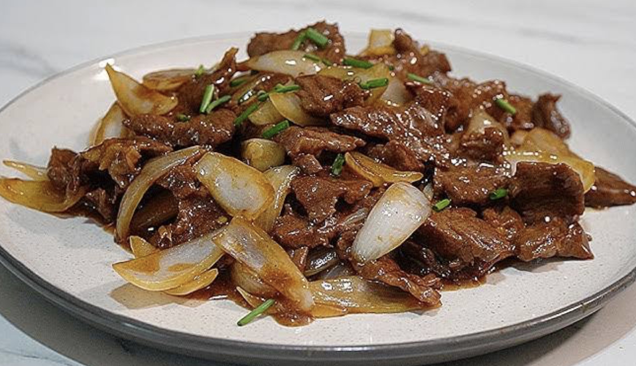 Beef pieces marinated and tossed in the pan with diced onions and fresh capsicum